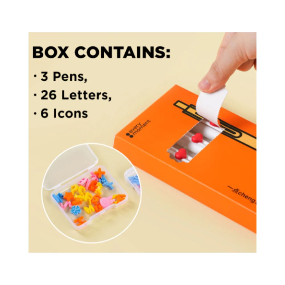 Unleash your creativity. The pens comes in 2 types of packaging- box and paper and each pack contain 3 dynamic pens, 26 expressive letters, and 6 iconic symbols.