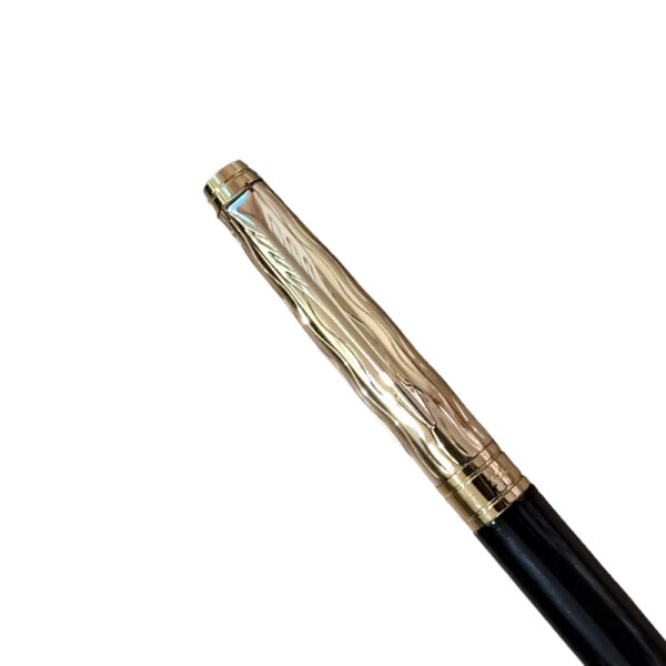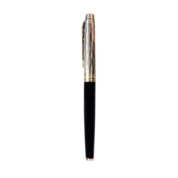 The Parker Aster Black & Gold Essential GT Rollerball Pen is part of the Parker Aster Premium collection. Parker presents this Aster Essential fountain pen that looks elegant with its lacquered black barrel. The brushed golden finish at the gripping section ensures a comfortable grip and an enjoyable writing experience. The golden accents on the satin gold lacquered cap further add to the appeal of this fine writing instrument. This is a cap on/cap off pen. Rollerball pen has a Ultra Fine nib with smooth, consistent flow ink, Pens are usable with Ultra Fine Navigator rollerball refills.