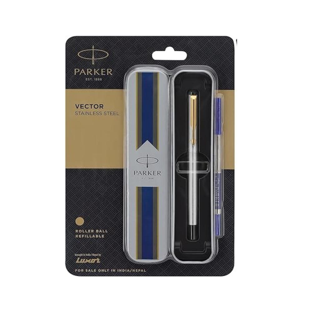 Home / Products / PARKER, Rollerball Pen - VECTOR | Stainless Steel | Gold Trim.