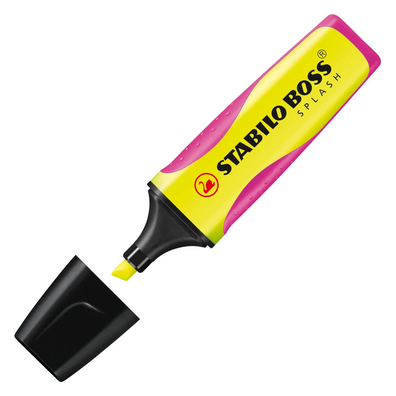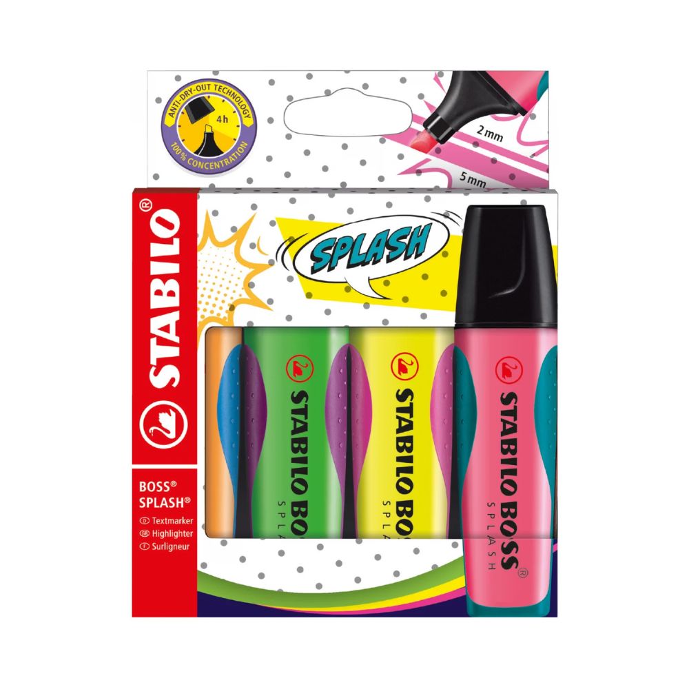 • The STABILO BOSS SPLASH highlighter in a pack of 4 with the fluorescent colors yellow (24), green (33), orange (54) and pink (56)