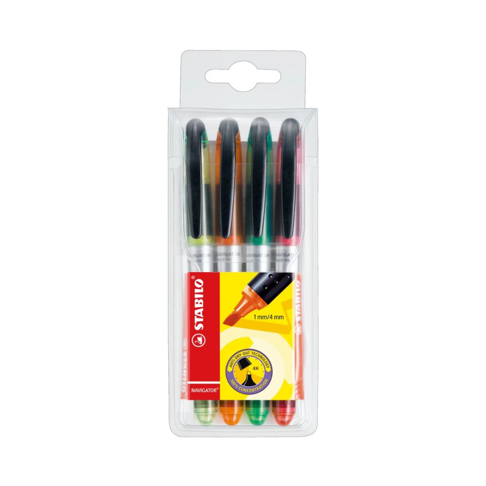 • The STABILO NAVIGATOR highlighter in a pack of 4 with the fluorescent colors yellow (24), green (33), orange (54) and pink (56)