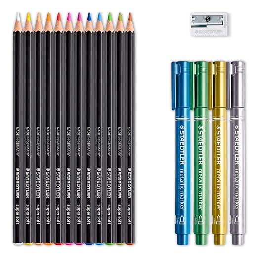 • Contains: 12 x super soft coloured pencils in assorted colours, 4 x metallic markers (blue, green, gold, silver), 1 x metal sharpener.